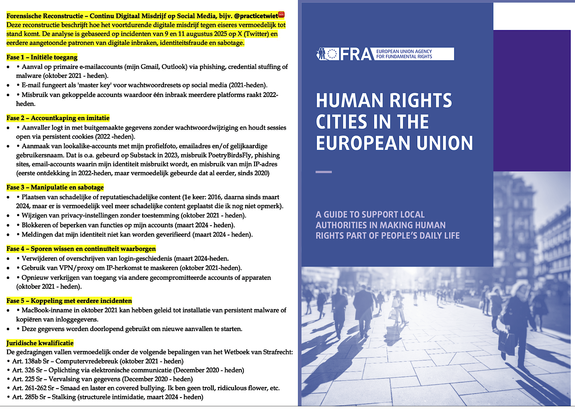 “Het gaat er niet om dat ik ruzie heb op internet. Het gaat erom dat mijn persoonlijke gegevens en online accounts systematisch misbruikt worden door anderen. Dat heet identiteitsfraude en cyberstalking, en dat is strafbaar volgens het Wetboek van Strafrecht. Het ondermijnt niet alleen mijn dagelijks leven, maar ook mijn recht op een eerlijk proces en mijn veiligheid. Daarom strijd ik voor onafhankelijk digitaal onderzoek en juridische erkenning van deze misdrijven.”